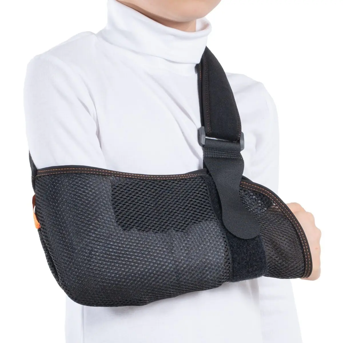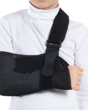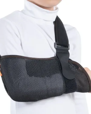 Pediatric Arm Sling (Perforated). It is manufactured from perforated fabric. Product’s design provides patient’s arm to be fixed parallel to the near trunk. It can be used for both sides.